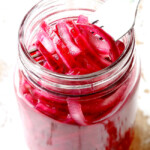 Thicker onions will take longer to pickle. You are welcome to slice the onions closer to ¼-inch thick, but be mindful they will be crunchier. Thicker onions will require several hours to pickle, up to overnight.