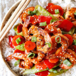 Shrimp stir fry is a complete meal-in-one and easy to make at home in less time than driving to your favorite Chinese restaurant! It’s bursting with juicy shrimp and crisp tender veggies enveloped in a drool-worthy orange sweet and sour sauce laced with ginger, garlic and chili sauce. This shrimp stir fry recipe is easy to make with a quick marinade while you chop the veggies then you’re just a 10-minute stir fry away from dinner. This recipe is also easy to customize with whatever veggies you love from bell peppers and snow peas to, carrots, mushrooms and zucchini. Complete shrimp stir fry recipe with steamed rice or low carb cauliflower rice, homemade egg rolls and cream cheese wontons for a complete Chinese feast.