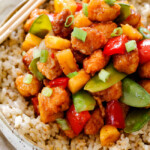Veggies. Panda Express Sweet Fire Chicken uses onions and red bell peppers. I’ve added the snow peas which are optional. Feel free to customize the veggies with what you have on hand.