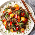 Return the beef and pineapple to the skillet. Whisk the sauce to recombine then add to the skillet. Cook, stirring constantly, until the sauce is thickened, the beef is cooked and vegetables are crisp tender, about 1-2 minutes. Stir in about half of the green onions. Taste and add additional Asian chili sauce,