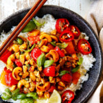 Whisk the sauce to recombine, then add it to the skillet and cook, stirring constantly until thickened, 2-3 minutes. Remove from the heat and stir in the basil and cashews. Taste and season with additional chili sauce for spicier, lime juice for tangier or sugar for sweeter.