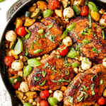 Melted mozzarella. I’ve added mozzarella snacking balls at the end of cooking so they remain cheesy balls of YUM, but you can swap them for freshly grated mozzarella or sliced mozzarella that you add directly over the chicken or blanket the entire skillet and melt.